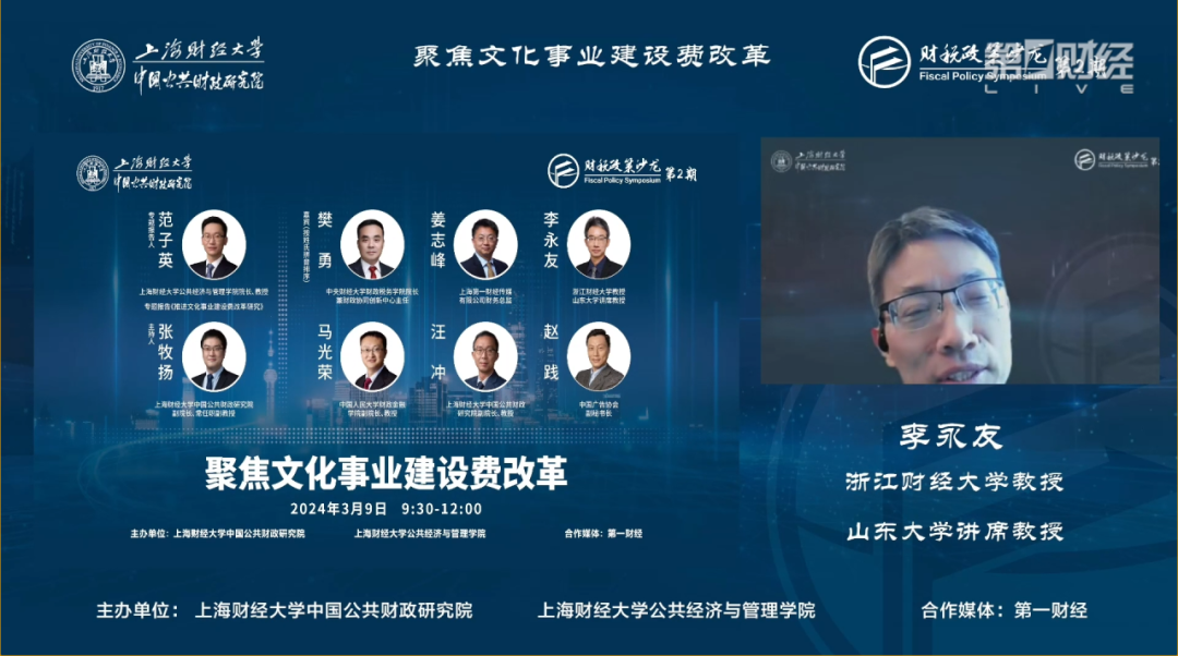 2024年3月9日上午,由上海财经大学中国公共财政研究院和上海财经大学公共经济与管理学院共同主办的财税政策沙龙第2期成功举行,并在第一财经网端大直播频道同步直播。数位财税领域和业界的专家学者,围绕文化事业建设费改革这一话题进行交流研讨,并对未来的改革前景进行展望。 李永友: 取消文化事业建设费的理论依据 随着经济社会的发展,文化事业建设费是否应该继续征收值得讨论,支持取消文建费主要有几方面的原因。第一,上世纪九十年代开征文化事业建设费有两点理由,在当今这两个征收理由的理论基础正变得非常薄弱,说服力不再那么强。以前国家特许经营的资源,现在看来正在消失,大部分的企业,特别是互联网企业,没有因为国家赋予它某种特许经营资源而获得超额的利润,但要交一笔特别的费用,就存在一定的不合理性。第二,从文化事业建设费的使用来说,费用征收是为了解决公共文化事业的发展。以前由于财政资金不充足,会专门收取各种专项费用用于支持特定的行业进行特定的服务,这些专项费用属于特定行业主管部门的预算。这个征收的理由现在看也不再合适。 不同地区的文化事业建设费征收有较大差异,征收可能会造成文化产业之间的竞争不平衡,不利于文化产业的发展和全国统一大市场的建立。有的地方文化事业建设费占公共文化支出的比例低于1%,甚至低于0.01%,这些地方没有必要再征收如此少的费用收入。而像北京、上海、四川等地方,文建费占公共文化支出的比例较高,继续征收会带来不公平竞争,不利于文化产业的发展。近年来,文化产业的发展发生了很大的变化,文化事业建设费的征收依据、征收基础已经发生了翻天覆地的变化,广告娱乐服务等新兴业务又不在征收范围内,文建费的征收是否依旧合理值得商榷。此外,还要考虑征收效率的问题,征收文化事业建设费的成本也应该进行核算,比较征收的成本收益问题。 如果下一步要考虑对文化事业建设费进行配套性的改革,就会涉及到放权的问题。现在文建费收入大部分归入省级国库,若要放权到地市,带来的一个问题是地市间不同的制度设计,会不利于统一大市场的建设。而如果能全面取消文化事业建设费的征收,这一系列的问题就都会解决。全面取消文建费之后,要通过加强一般公共预算对文化事业的支出保障力度。一般公共预算里本身就有这方面的支出,但支持方向应该做相应调整。原来大部分支出是人员经费,真正支持文化事业发展的并不多,文化事业发展是公共文化事业发展,不是传统意义上说的文化产业的发展。最后,要加强地方国有文化产业投融资平台的建设,通过平台公司的建设来助力文化产业的高质量发展,厘清市场和政府的边界,理清文化事业、文化产业之间的关系,区分投入主体,分清责任,保障文化事业和文化产业发展的资金需要。